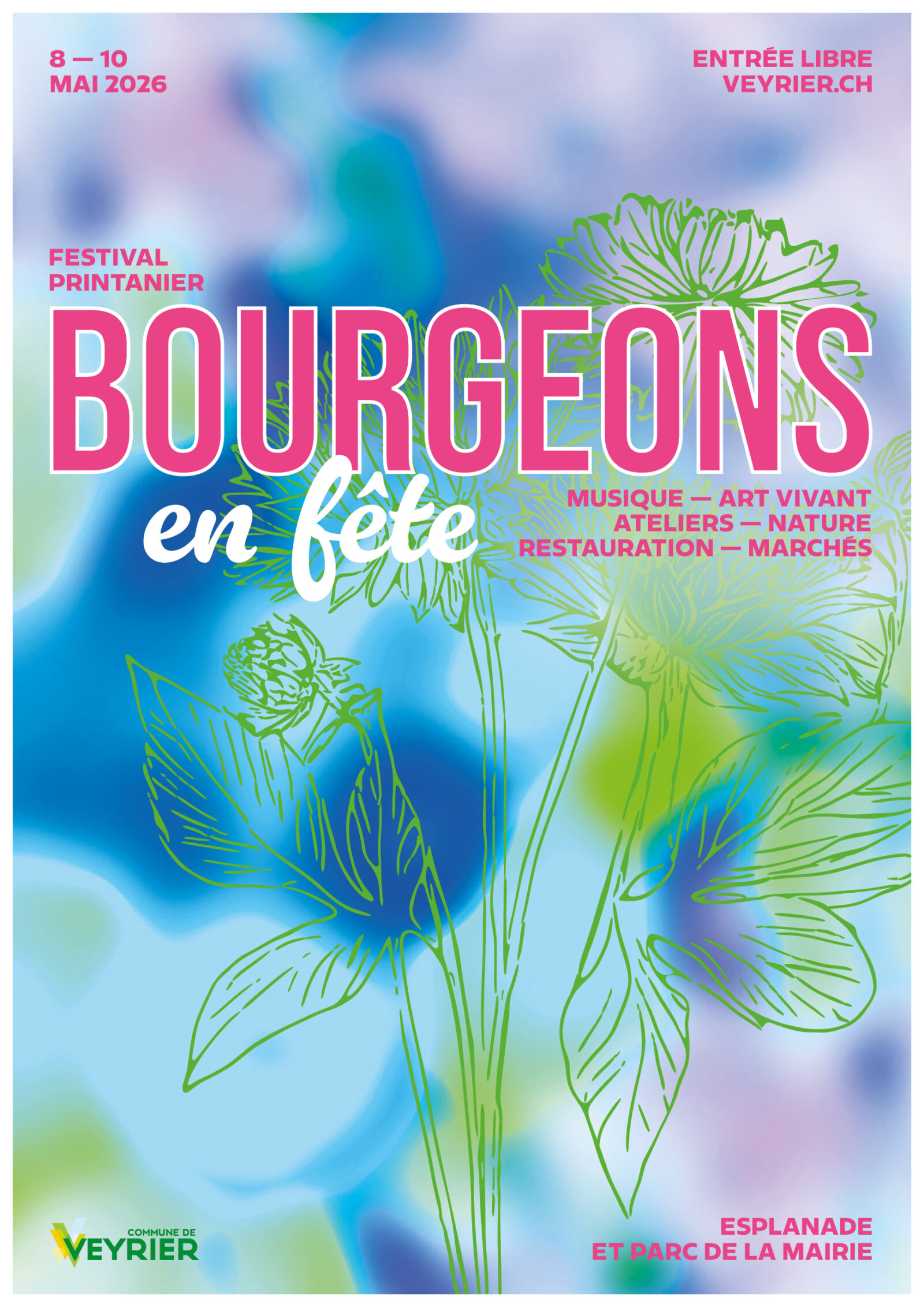 Le festival printanier Bourgeons en fête revient à Veyrier du 8 au 10 mai 2026 pour une troisième édition festive et conviviale au parc et à l’esplanade de la mairie. Pendant trois jours, habitants et visiteurs sont invités à célébrer l’arrivée du printemps autour d’un programme riche mêlant spectacles, ateliers créatifs, concerts, marchés et restauration locale.