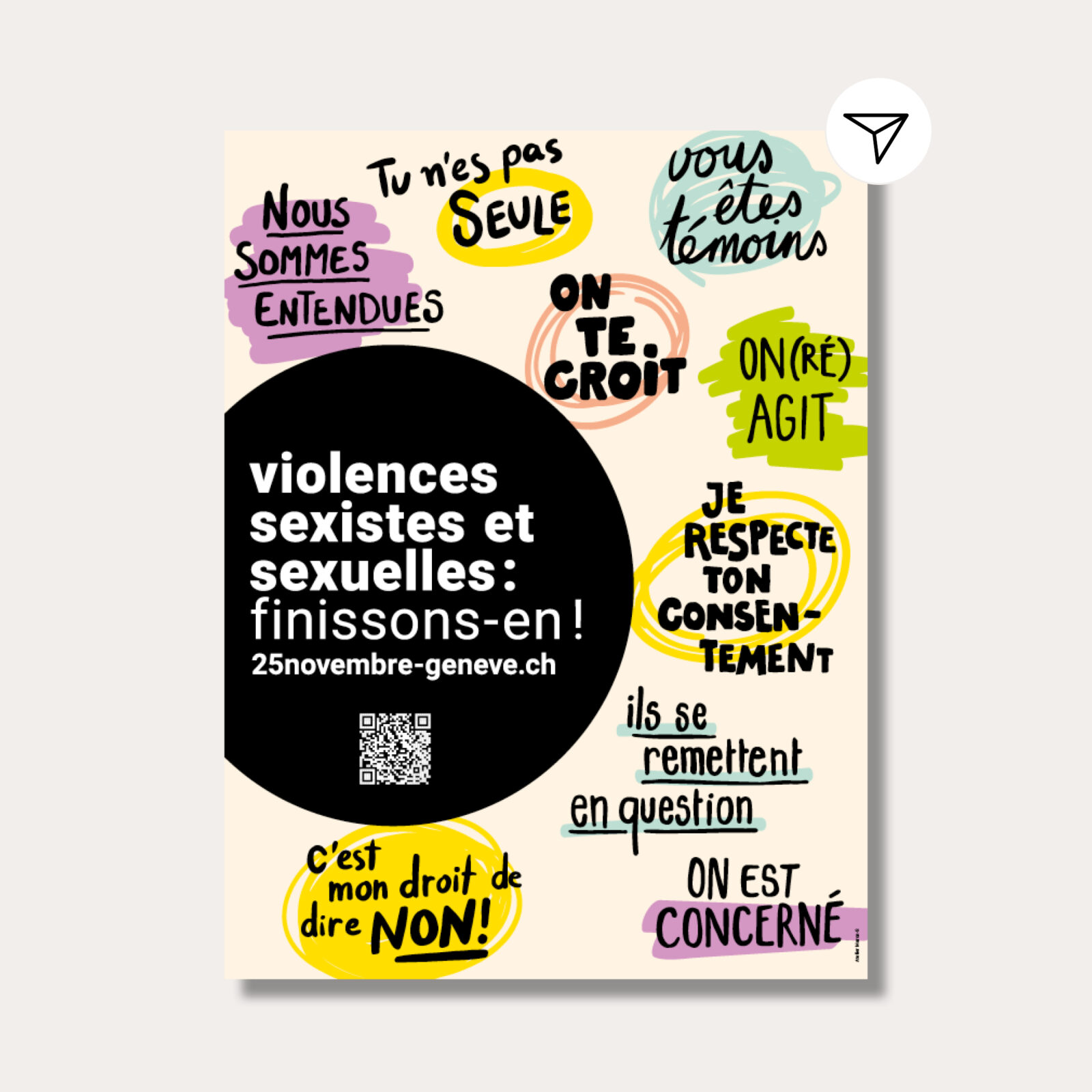 L’édition 2025 de la campagne « Violences sexistes et sexuelles : finissons-en ! », qui se déroulera du 10 au 30 novembre, combine affichage public et plus de vingt événements : conférences, projections, ateliers, performances et formations. Le visuel de la campagne traduit cette responsabilité collective et s’adresse à toutes les personnes concernées : victimes, auteurs ou témoins. Ses différentes typographies et couleurs donnent voix à la diversité des expériences et rappellent que chacun·e peut agir.